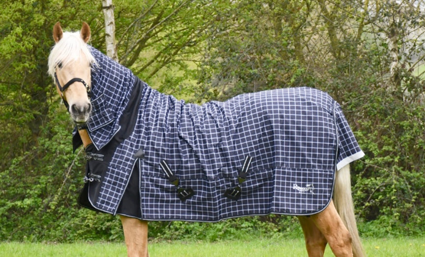 This striking checked light-mid weight turnout rug has a 600 denier, ripstop, breathable, waterproof outer with 100gsm Polyfill and a breathable nylon lining. A multi-adjustable chest with twin buckles to create the perfect fit and trigger hooks for everyday ease. The neckline and chest panel benefit from a waterproof stretch material to aid in the freedom of movement and comfort for the Horse. The full neck design of this rug gives full coverage from mud and the elements, with easy touch tape fastenings.